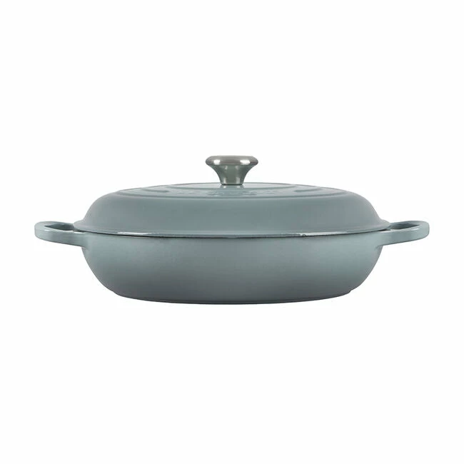 The enameled cast iron braiser is uniquely designed for maximum performance, transforming tough cuts of meat and hearty vegetables into tender, flavorful dishes. Food is first seared over high heat, then finished slowly in a flavorful liquid. The wide base of the braiser allows ingredients to be placed in a single layer for proper searing; once liquid is added, the domed lid continuously circulates steam to lock in moisture and flavor.