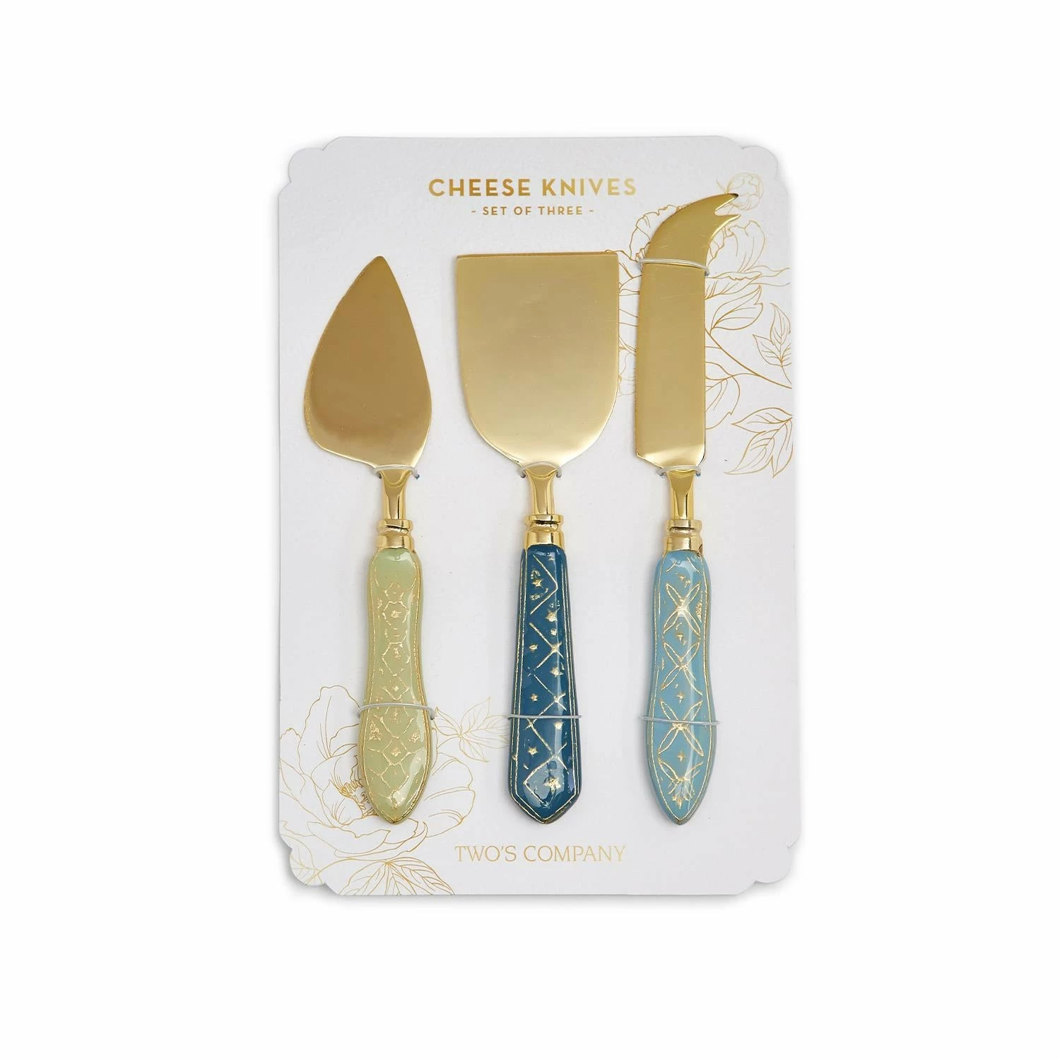 The perfect gift for any cheese lover! Each knife has its own exquisite design assorted in 3 different rich colors. Slice and serve hard cheese with ease with this beautiful set!