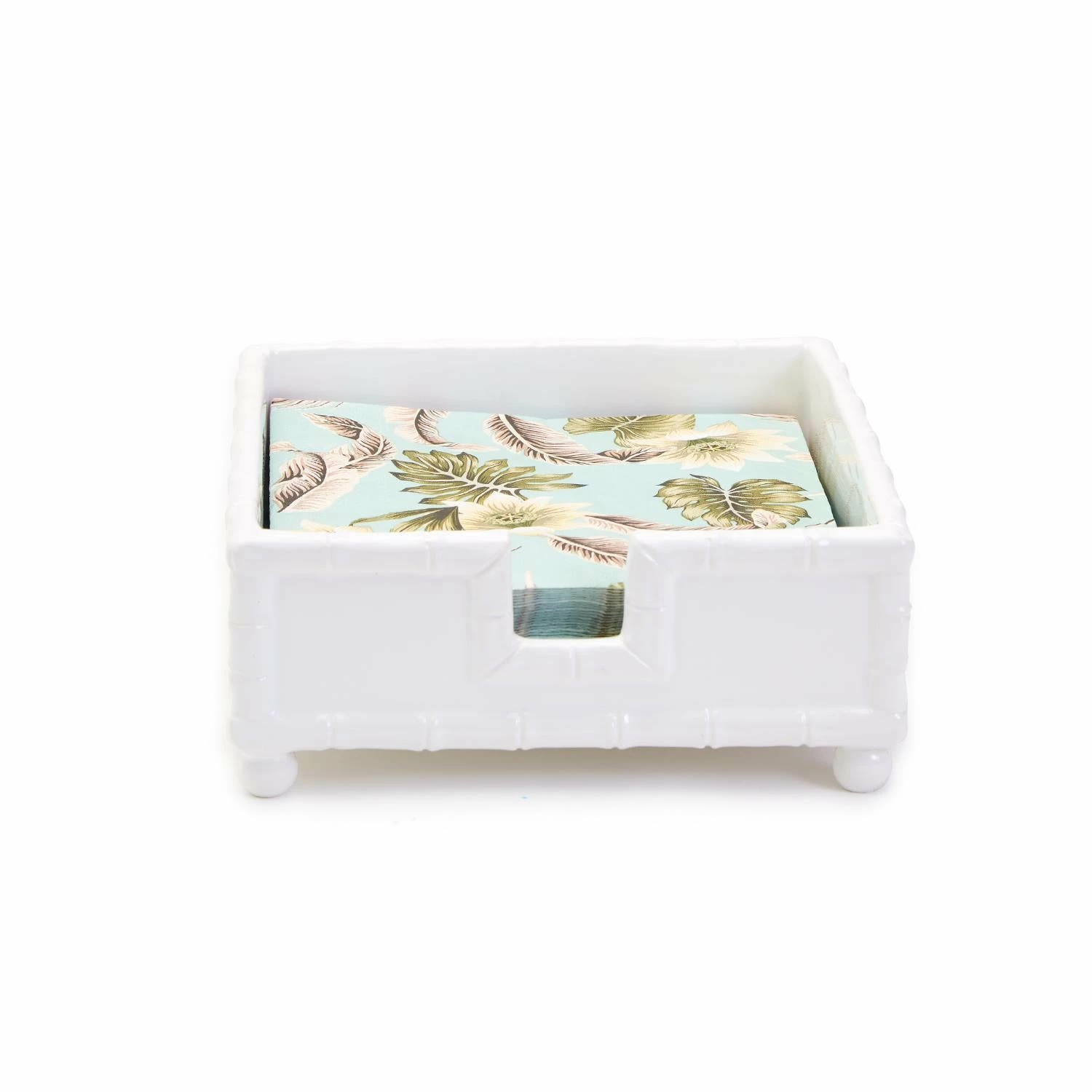 Keep napkins neat and orderly with this glazed ceramic Cocktail Napkin Holder. The Ceramic has been molded into the shape of Bamboo around the edges and features 4 round feet so it stands raised above your countertop.
