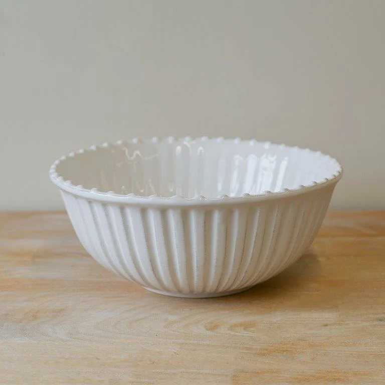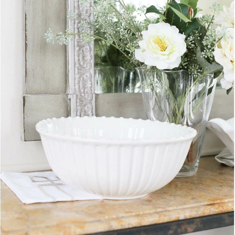 Great size and texture on this serving bowl, finished with beaded trim edge. Perfect for salads at your next party, or wrapped up as we wedding gift!