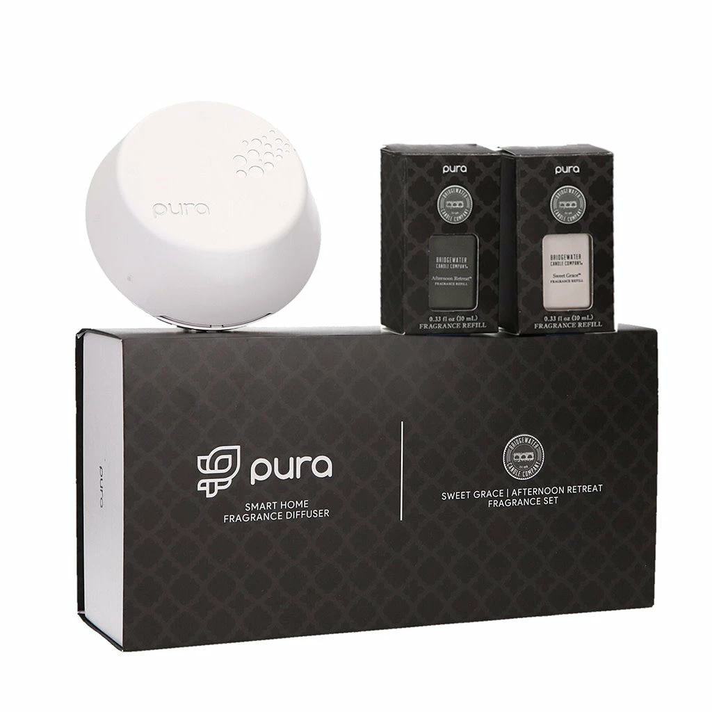 This Smart Home Fragrance Diffuser powered by Pura allows you to fill your home with two of Bridgewater’s best-selling fragrances. Once you plug in and set up your diffuser using the Pura app, you can then control your device from virtually anywhere and set custom schedules to suit your lifestyle. Kit Includes: One Smart Home Fragrance Diffuser Powered by Pura One Sweet Grace Fragrance Vial: With exotic passion fruit, sparkling tea and classic patchouli, Sweet Grace is undeniably warm, peaceful and pure. One Afternoon Retreat Fragrance Vial: Sink back into a bed of soft moss, teak, sandalwood and amber as a light, refreshing breeze of bergamot and lime sweeps through the air. Control from anywhere using the Pura app Set custom schedules to suit your lifestyle Swap between 2 scents and adjust scent intensity Includes an LED ambient nightlight Pet and kid friendly Once you receive your Pura device, download and launch the Pura app Create an account and follow the app onboarding steps Enjoy your Pura + Bridgewater