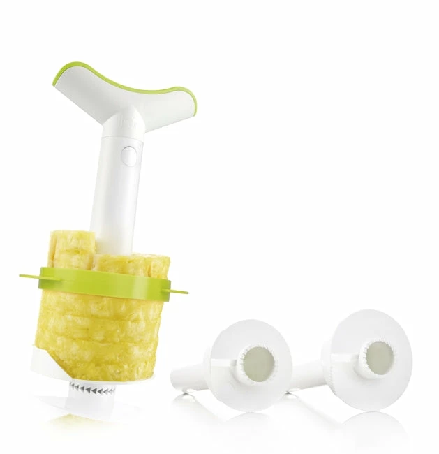- Push the quick-release button on the handle to slide the pinapple rings off, or use the wedger to make pineapple chunks