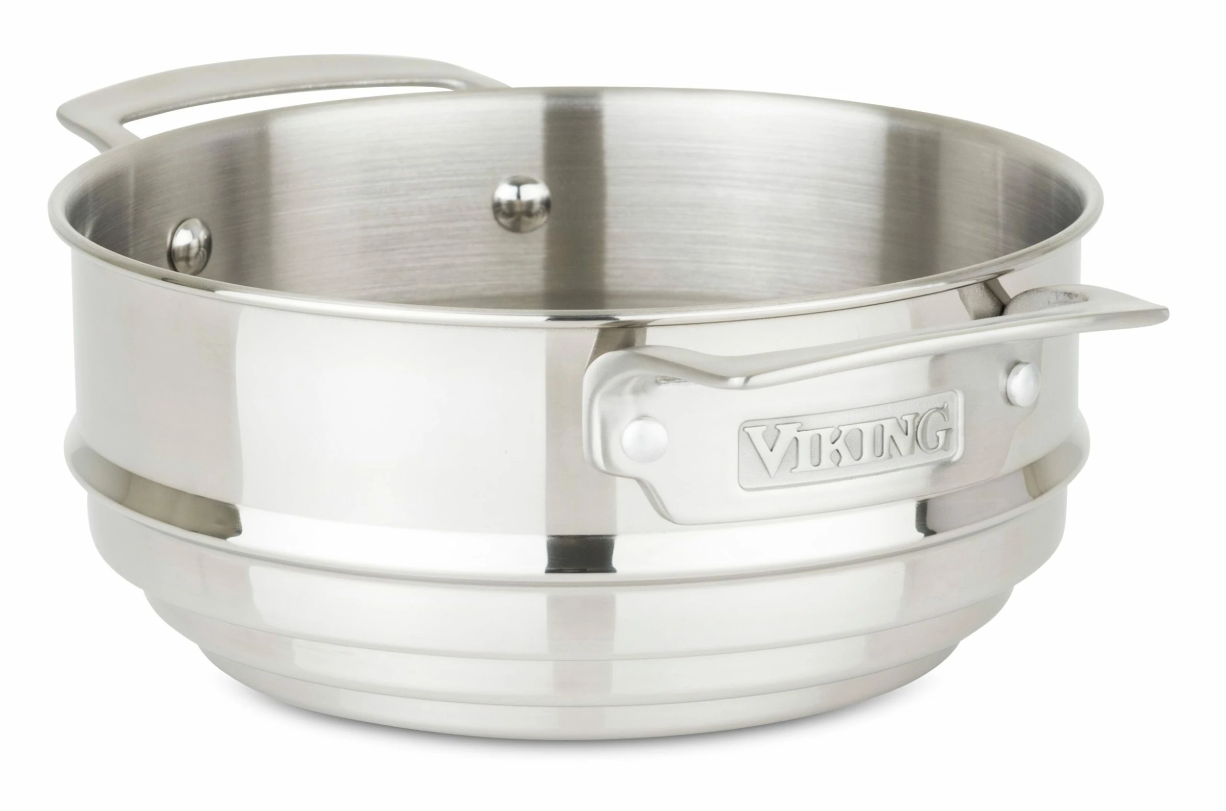 The Viking universal steamer insert fits most Viking 2, 3, and 4 qt saucepans. It will also fit most standard 6.25, 7 and 8 inch diameter (16 cm, 18 cm and 20 cm) saucepans and casseroles, turning them into steamers for vegetables, dumplings, fish and more. Constructed from surgical grade 18/8 stainless steel, the Viking steamer is non-reactive and will not react with acidic foods. The strainer doubles as a colander for straining and washing foods before and after cooking. The Viking universal steamer features riveted cast stainless steel handles for Comfort, balance and control. Oven, grill and dishwasher safe.