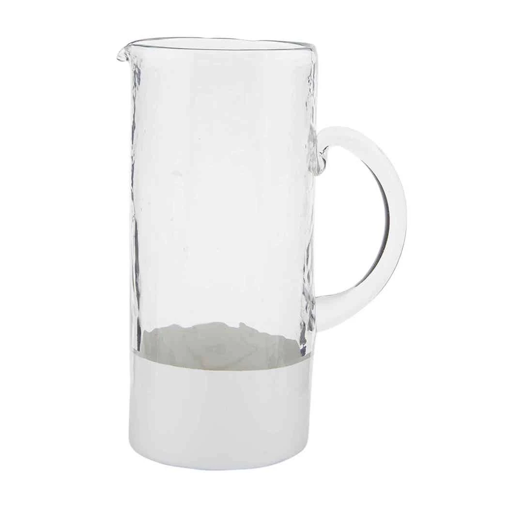 Toss back your favorite drink with our White Two-Tone Glass Pitcher. The hand-painted glass pitcher features textured details on the side. The bottom of the pitcher features a white color-blocked section. This pitcher is perfect for summer gatherings! Fill with your favorite lemonade recipe.