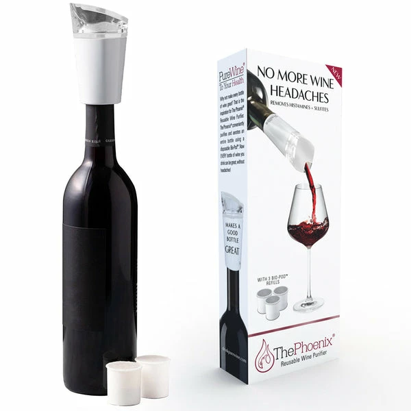 The Phoenix® is the only reusable wine purifier and aerator to remove both histamines and sulfites from wine as you pour. Alleviates wine headaches, stuffy nose, skin flushing and next-day hangovers while enhancing the natural taste, aroma and color of the wine.